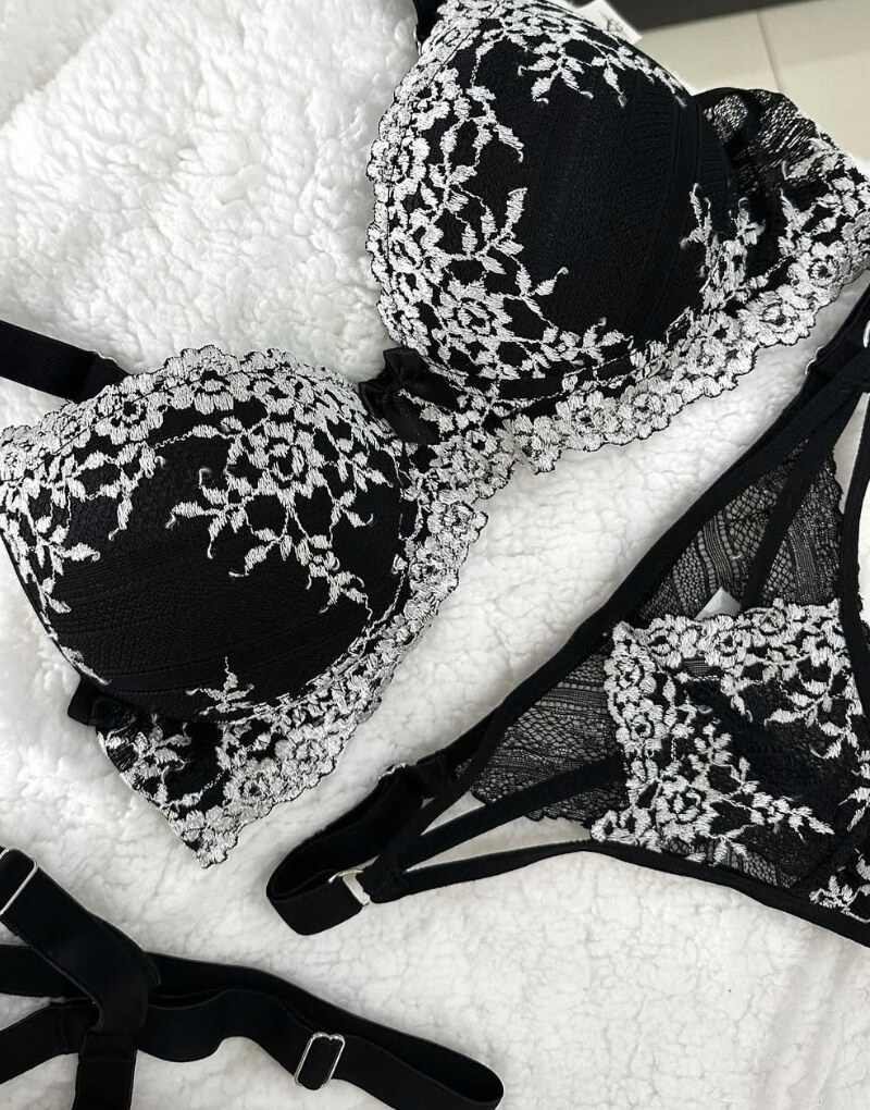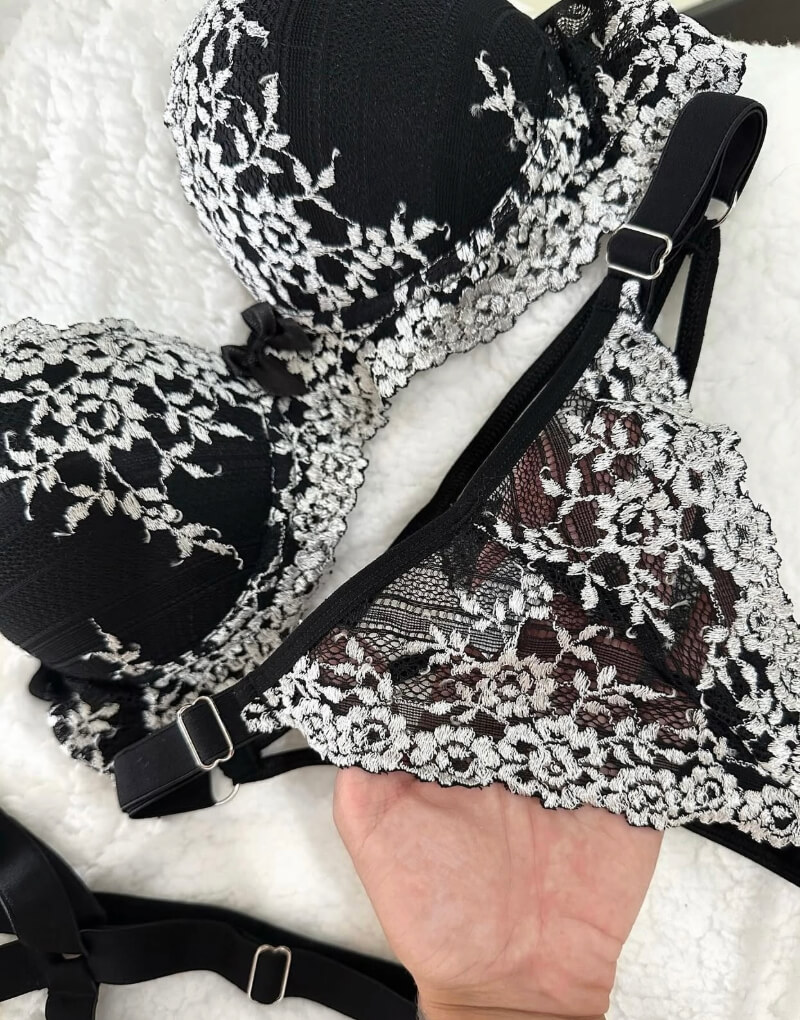 Um conjunto sofisticado em preto com renda floral branca, que une sensualidade e elegância em cada detalhe. Ideal para ocasiões especiais ou para quando você quiser se sentir poderosa.