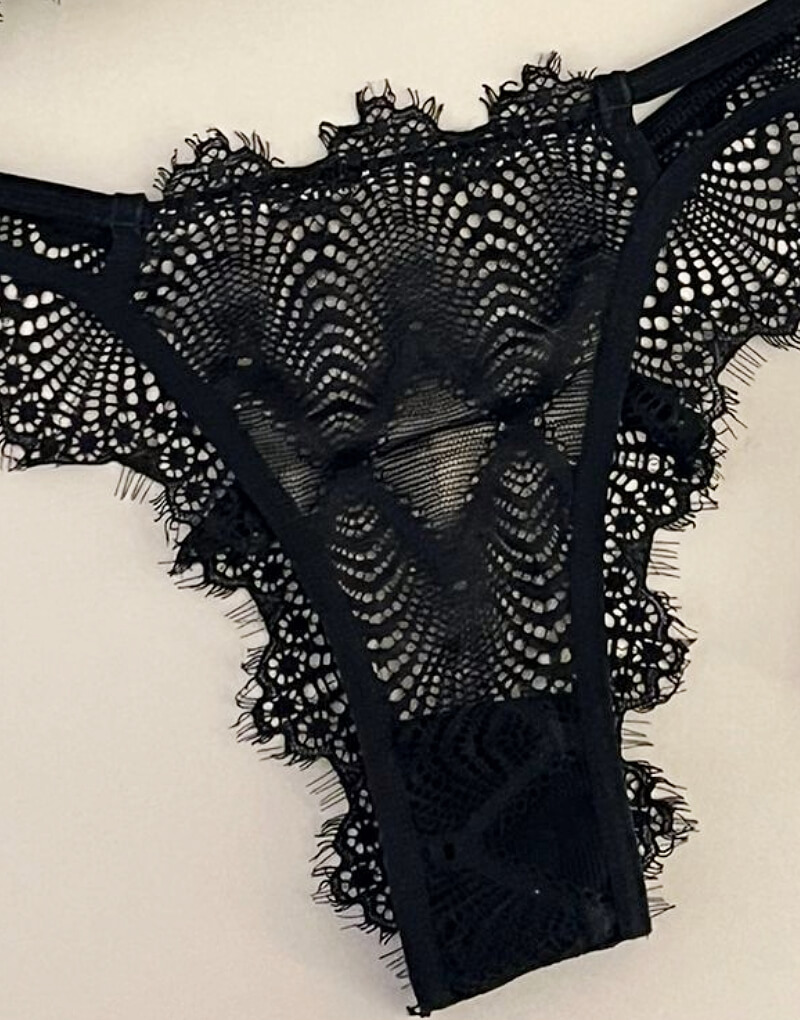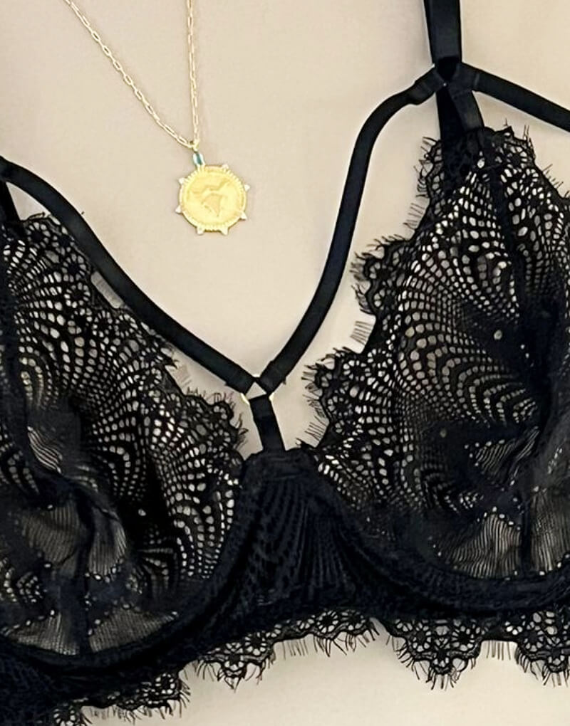 Misteriosa como a noite sem luar, Lua Negra é um conjunto de lingerie que celebra a força do feminino em sua forma mais sedutora. A renda detalhada, com desenhos que lembram ondas hipnóticas, se une a tiras estrategicamente posicionadas que insinuam sem revelar demais.
