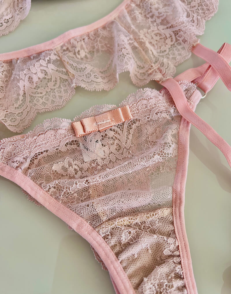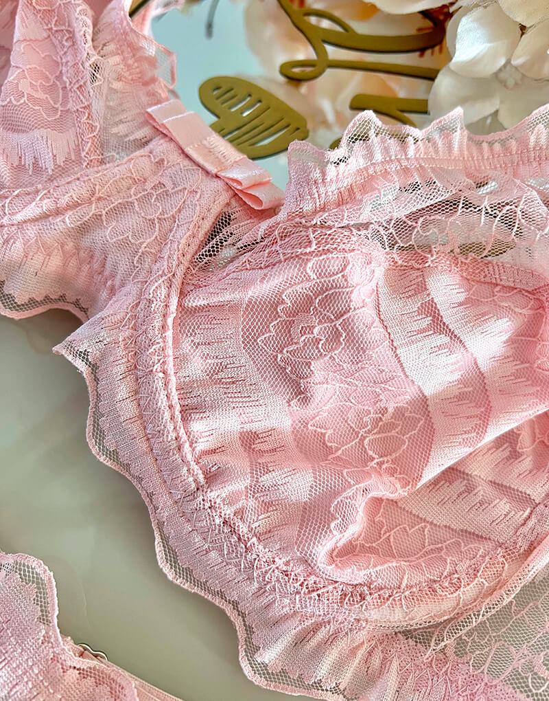 Delicada como uma flor ao amanhecer, Pétala Rosa é a tradução da feminilidade em forma de lingerie. Confeccionado em renda floral suave e translúcida, o conjunto encanta com seu tom rosado e acabamento em babadinhos que realçam cada detalhe do corpo com sutileza. O sutiã sem aro oferece leve sustentação e toque macio, enquanto a calcinha fio traz recortes que equilibram romantismo e sensualidade.